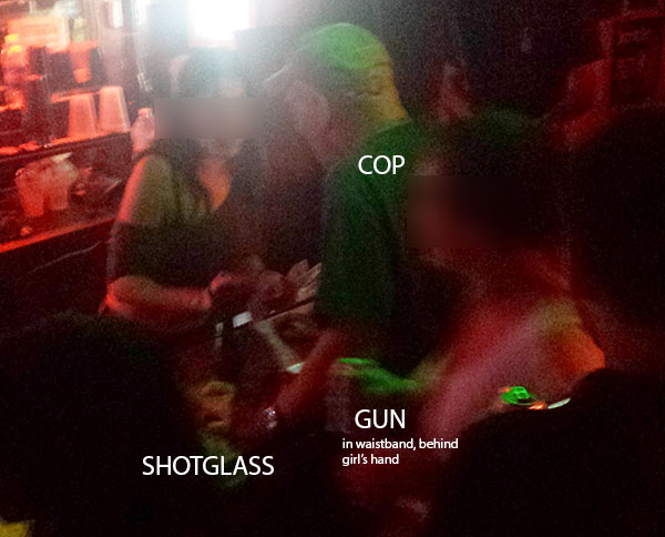 Last night, I was in an East Village bar when I noticed that a man was walking around with a full-sized semi-automatic handgun sticking out of his waistband. The man was wearing shorts and a t-shirt and made no attempt to hide his weapon. I assumed he was a cop based on the way he looked (style of dress, hair, posture) and the fact that the staff seemed unalarmed — not to mention the fact that citizens sure are sure as hell not allowed to open-carry, let alone concealed carry, in NYC. I wasn’t going to say anything until the guy started downing shots.
