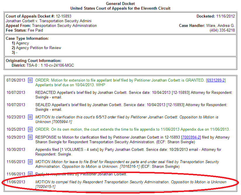 I have a copy of the motion, but I’m prohibited by court order from publishing it here (and it appears the clerk’s office has learned how not to accidentally post sealed documents). A “motion to compel,” as a general matter, is a request for a court to order someone to do something. Why would the TSA need to do this under seal? I unfortunately can’t answer that question for you yet. What I can say is that I filed my opposition to the motion today and asked the court to unseal the motion in its entirety.