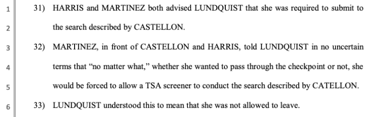 But, Ms. Lundquist did something that TSA screeners don’t like: when told she would have to submit to a “groin search” to “resolve” the alarm, and the screener clarified that they would “need” to touch her genitals, she refused consent; she said no.  Notwithstanding that TSA screeners are not law enforcement and it is not a crime to refuse to continue the screening process, being told no hurts their ego, and so a screener, backed up by two supervisors, did what they may not: they told her she may not leave, and that they would force her to comply if she did not: